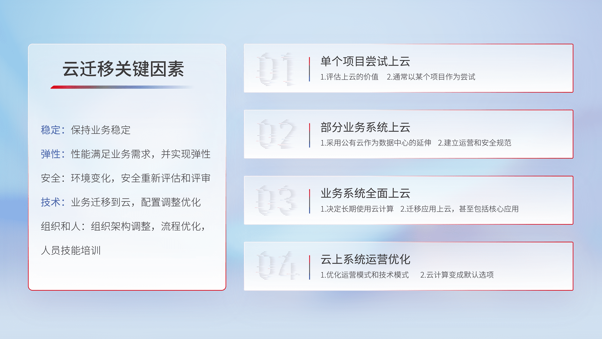 结合实际业务,,,,从规划设计、、、云平台选型、、、、云原生改造、、、、数据迁移、、、、集成交付,,,迁移全过程为客户识别最佳上云路径,,,,做好风险识别管理,,,设计网络架构、、身份权限、、、安全审计合规、、、操作审计、、、日志审计、、、监控告警策略、、、多站点容灾设计等,,对云上基础设施进行整体规划,,,,提升IT治理水平,,,,以满足弹性、、、、高可用、、、高性能的需求。。