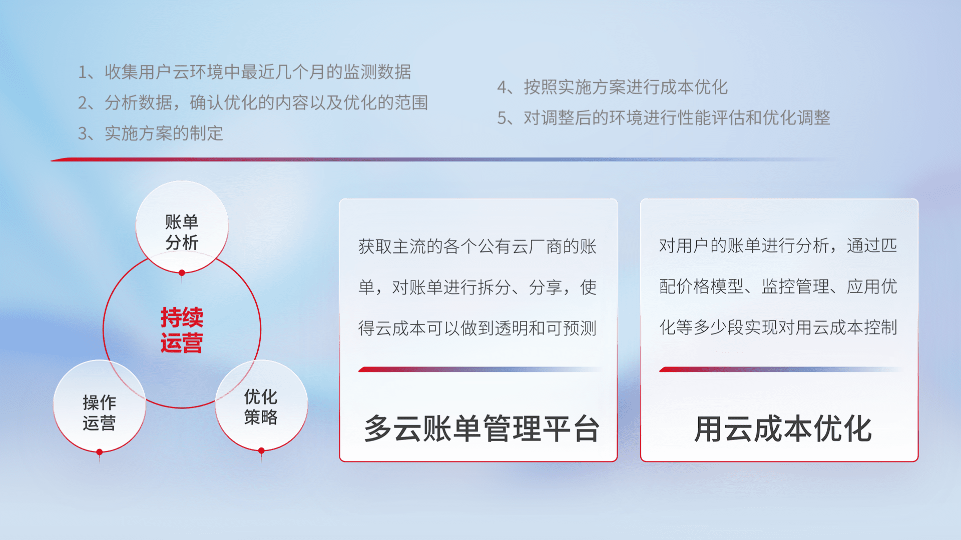 通过多云纳管,,,,以统一的资源数据模型把客户的云资源进行抽象和封装,,,进而实现对多云资源的统一操作,,,保障云资源管理的可靠性、、、稳定性与可用性。。。量身定制化运维内容,,,,配置、、、开发运维、、补丁管理、、、、备份、、、监控、、、认证和访问管理、、审计和日常巡检等,,保障在用云过程中的可靠度,,,,稳定度以及高可用率。。